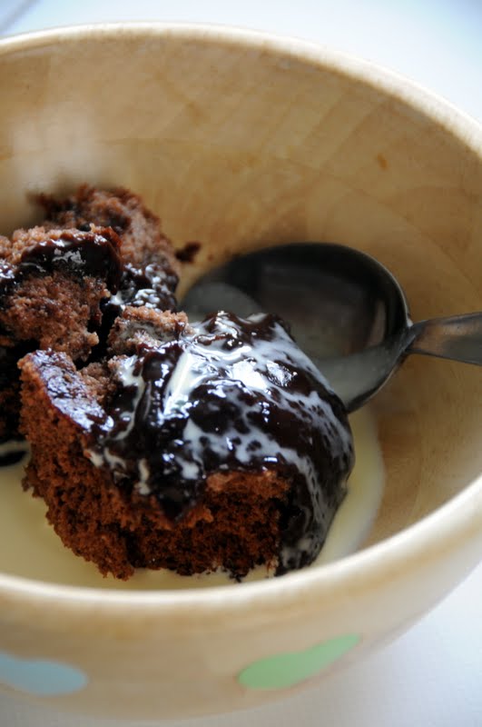 Intrigued by two recipes for microwaveable cakes, I tossed a coin and went for the Microwave chocolate steamed pudding (with its own chocolate sauce) over the Microwave lemon treacle pudding (though that will be next). It took a matter of minutes to put together, there are no eggs in the recipes though somehow, in just seven minutes I had a perfectly cooked, soft, squidgy, chocolaty pudding ready to serve. As my fellow tweeter Laura also said of the recipe, this is a dangerous one to have in your repertoire on the basis that chocolate cake fixes, reminiscent of comforting childhood or school puds, really shouldn’t be so easy to come by.