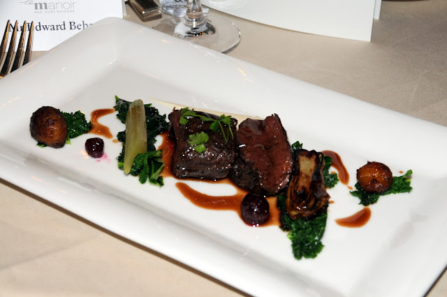 Raymond set his own scene for the evening; “I do not give speeches, I ramble.” A little self-critical perhaps since his stories were well-told, animated, warm and humorous. As Raymond jumped like a grasshopper from one story to the next, we sipped a mellow French 2008 Permiere Cru Grésigny from Bourgone. Raymond delved into rich descriptions of his childhood, his influences, his Maman, Grand Mère, restoring Le Manoir and the challenges he has faced. Despite a few “senior moments” as one brave staff-member joked, Raymond clearly had his audience engrossed.