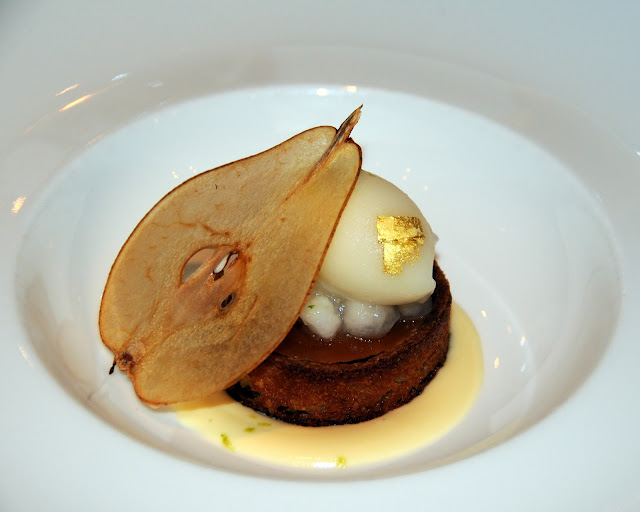 The six courses concluded with a very satisfying seasonal pear Almondine, topped with a caramel croustillant and ginger sauce, adorned with a crisp thin slice of pear and a touch of gold leaf. Coffee and beautifully made individual Chocolats du Manoir along with a few slugs of home-brewed Cassis finished off the evening respectably.