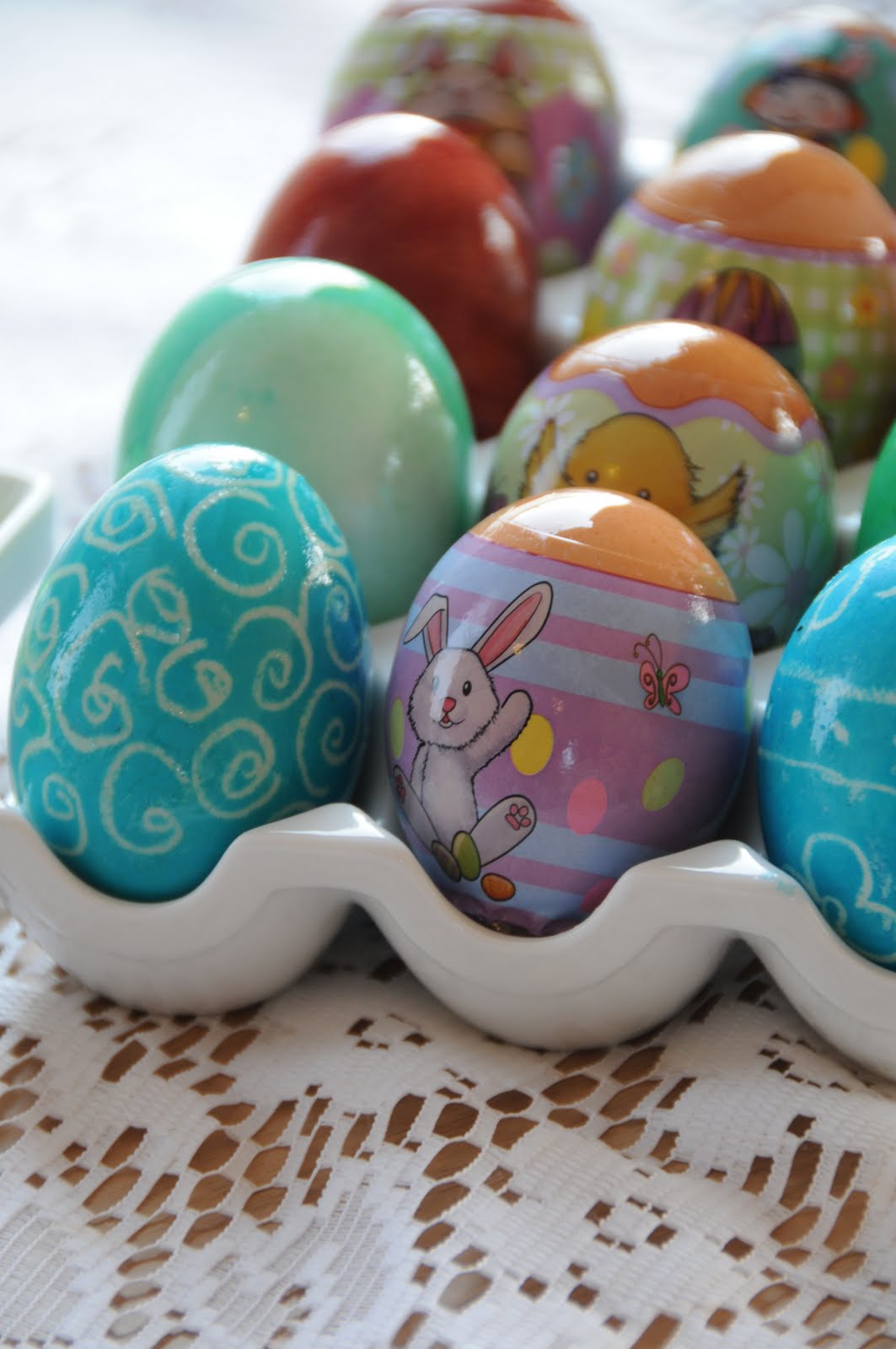 • For two tone eggs (such as the green one) dip the whole egg in dye for a few seconds, then take a shallower cup and place half the egg in the dye leaving the top bit exposed. (Ela’s tip)