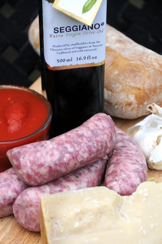 I also found some Salsiccia Finocchio – Fennel Seed Sausages – made at La Bottega di Ado, some fresh garlic, one white onion, fresh ciabatta and fresh basil.