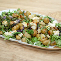 - Take the tray out of the oven. Arrange the rocket leaves onto a large platter. Scatter the roasted potatoes, asparagus and halloumi. Scatter over some fresh herbs and serve immediately.